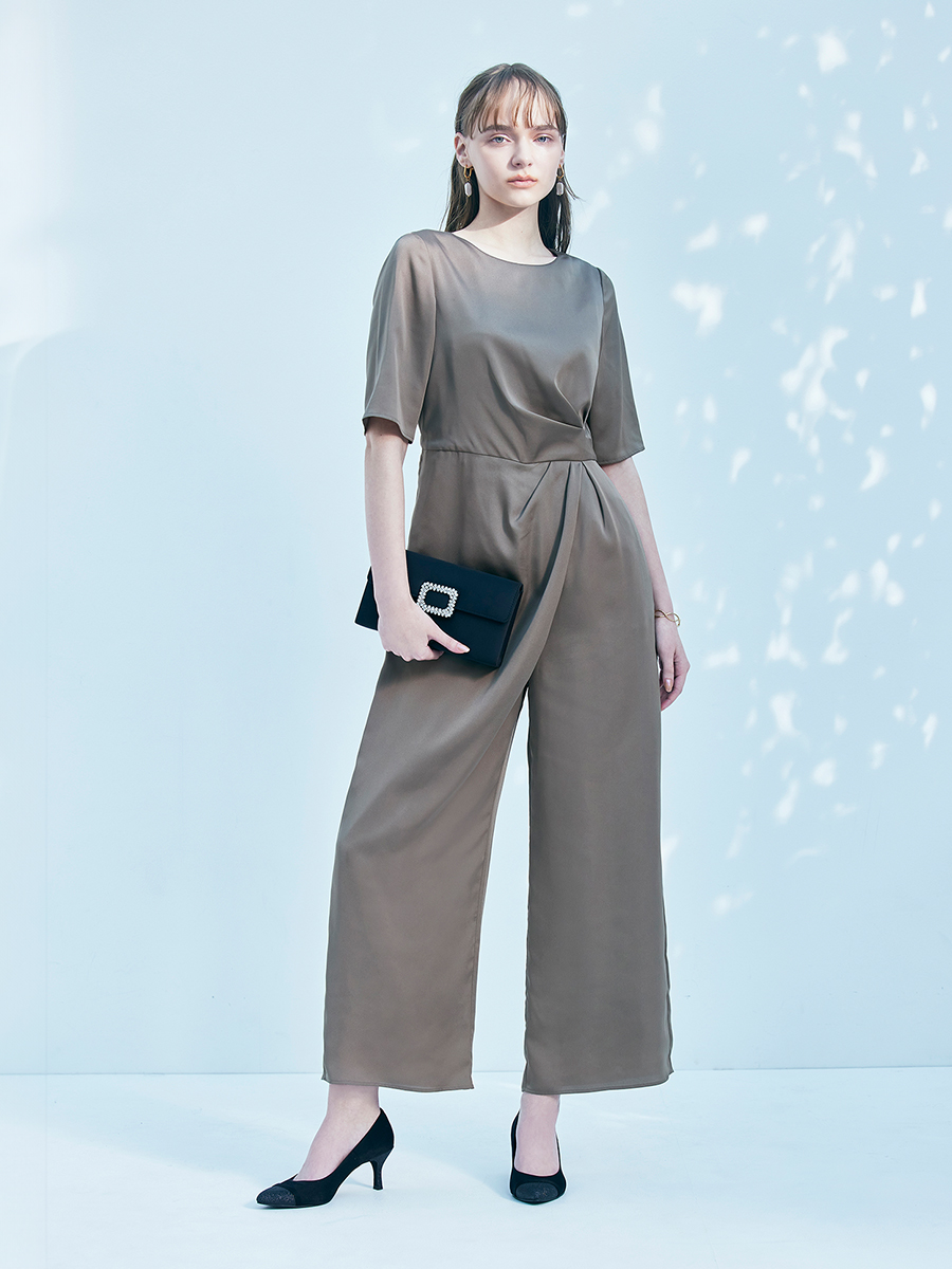 アシンメトリーなデザインがニュアンス感をプラスしてくれるワイドパンツドレス。