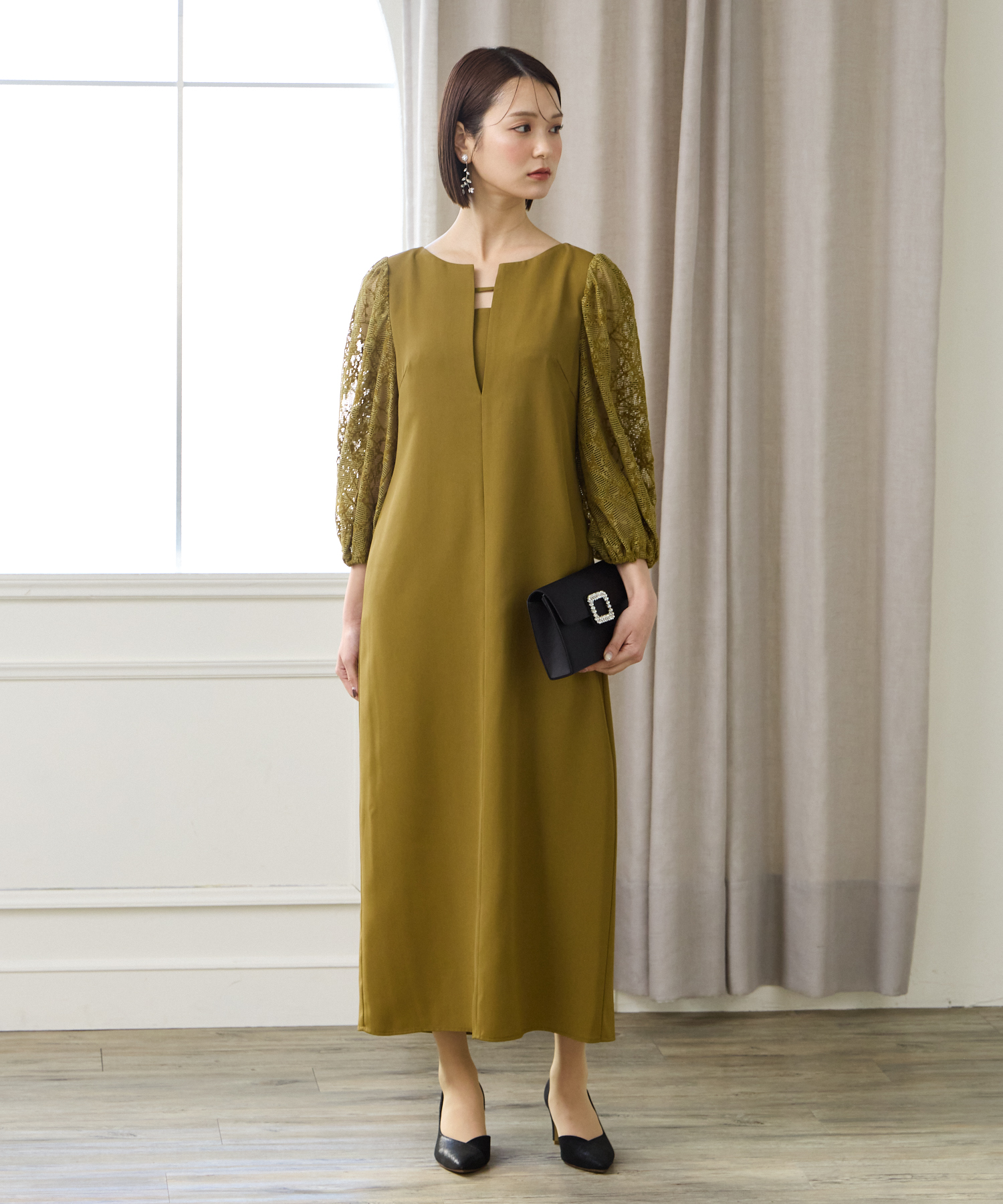 モール刺繍が印象的なボリュームスリーブドレス。