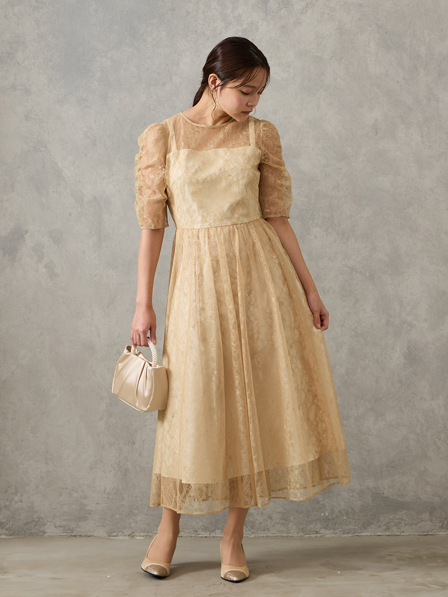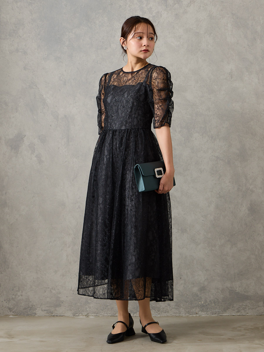 繊細なフラワーレースにシルバーラメ糸をミックスした華やかな素材のフィット&フレアドレス。ウエストを細く見せるレースアップ仕様で、スタイルアップが叶います。