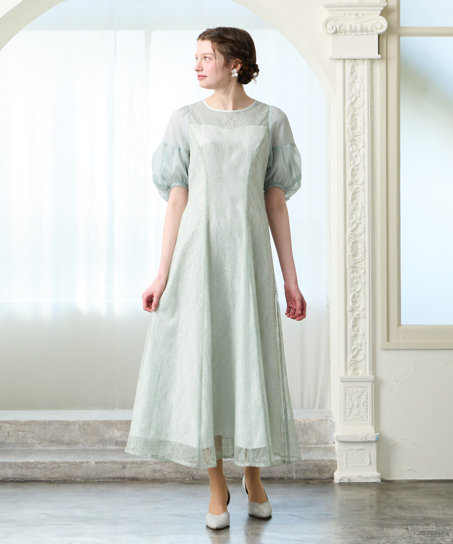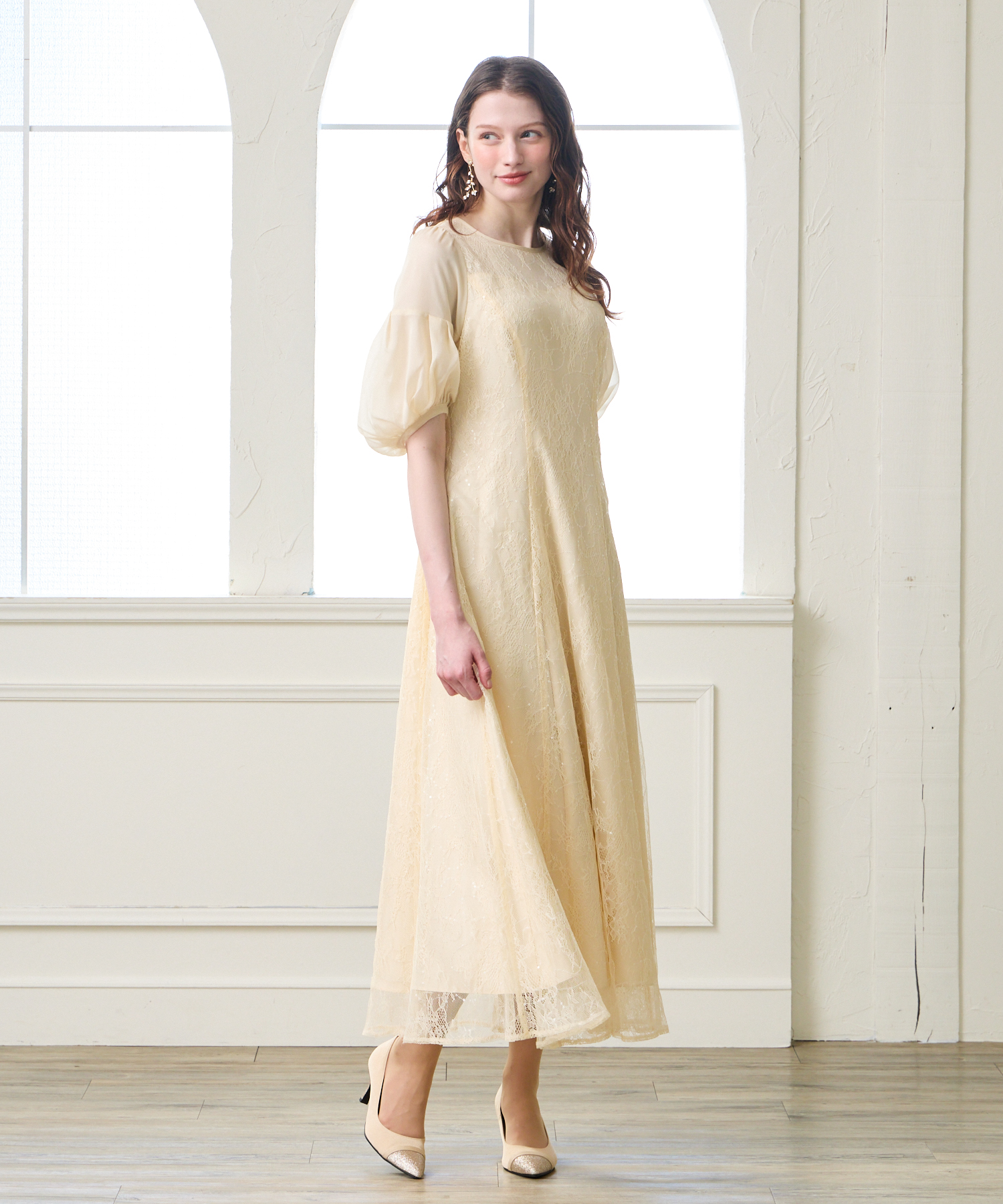 光をまとったようにきらめくレースと、ボリューム袖が目を惹く華やぎドレス。