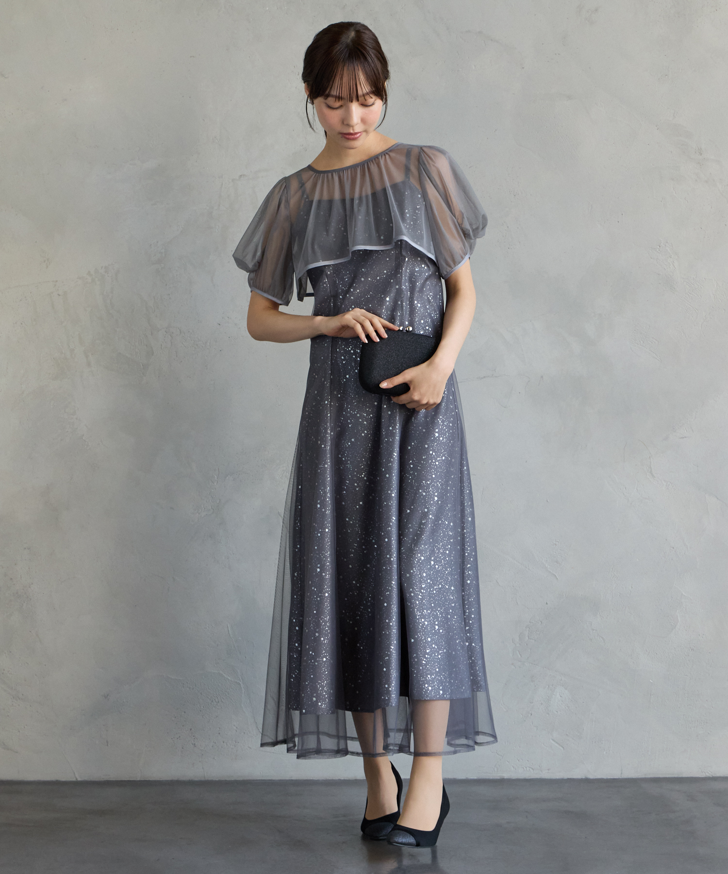 ホイル加工×チュールの重なりが生む、上品なきらめき感魅せる、大人フェミニンなオケージョンドレス。