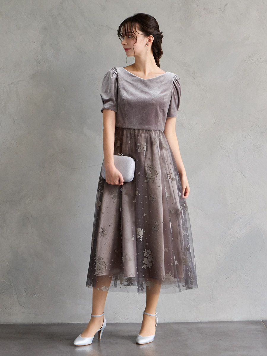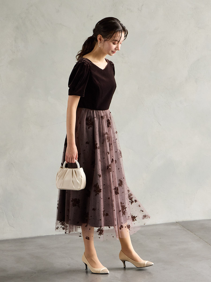 秋冬らしいベロアのぬくもりと、チュール×フロッキー加工のスカートが高級感あふれるフレアドレス。
