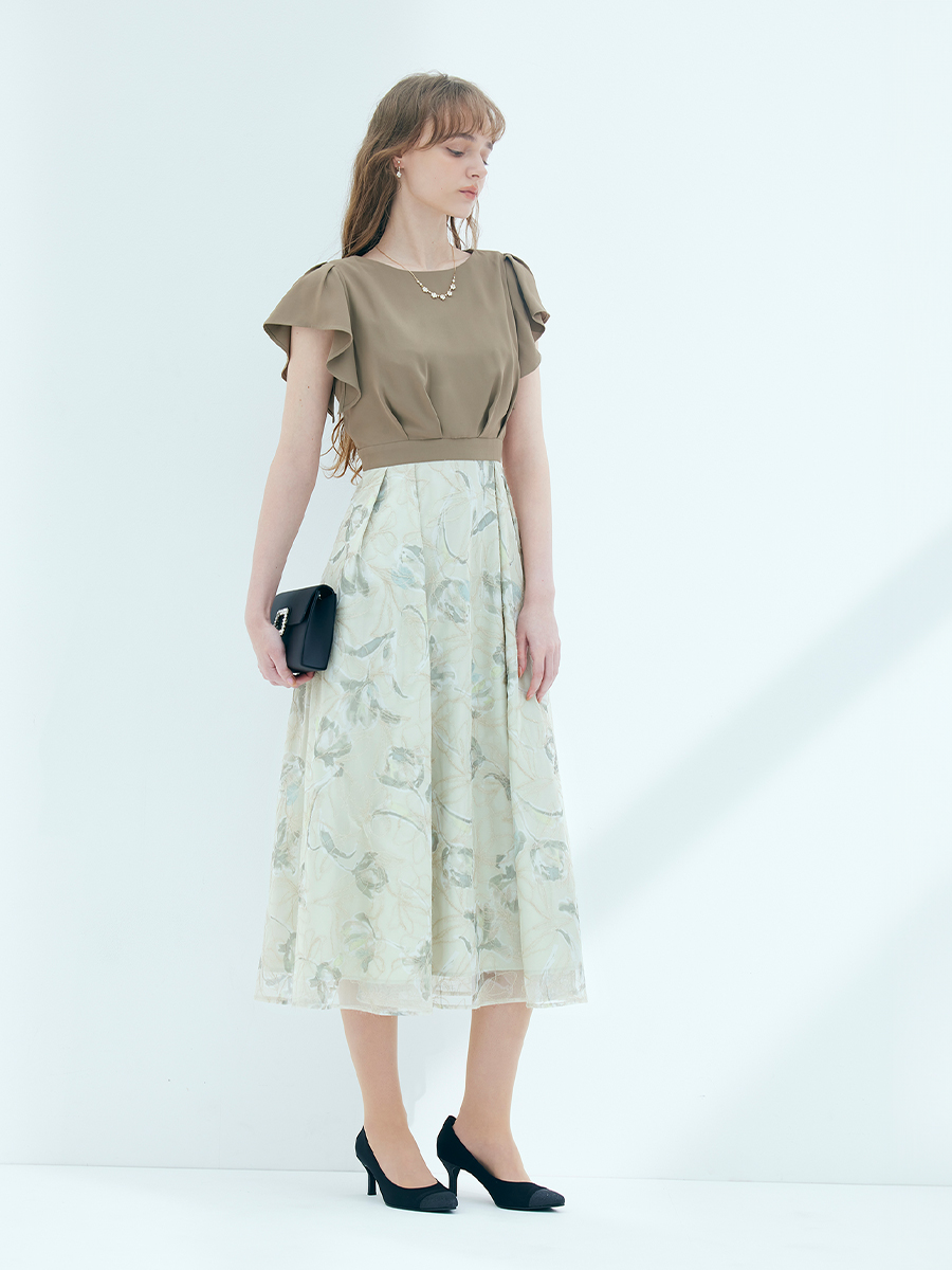 無地トップス×プリントモール刺繡スカートの上品なフィット&フレアドレス。