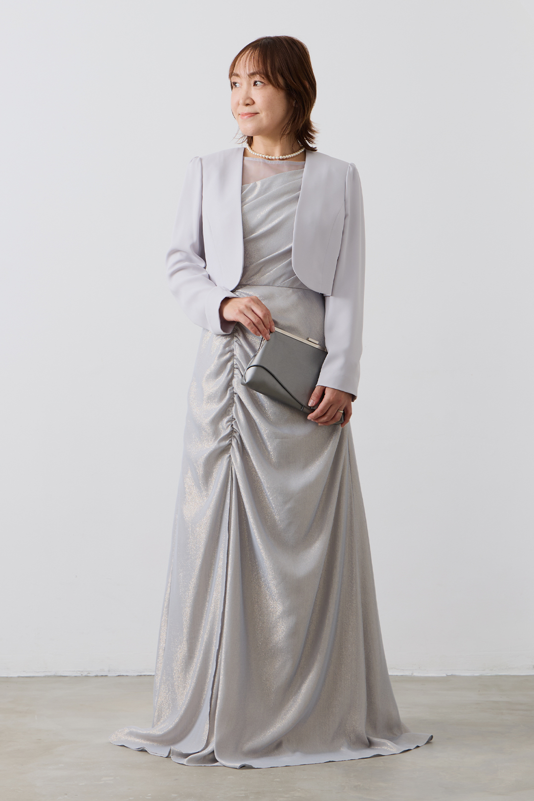 しなやかなギャザードレープが美しいラメジョーゼットのロングドレス。上品なライトグレーはおしゃれで抜け感のある1着。