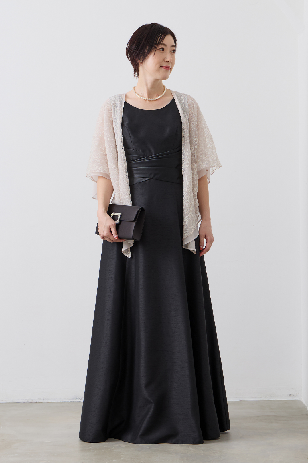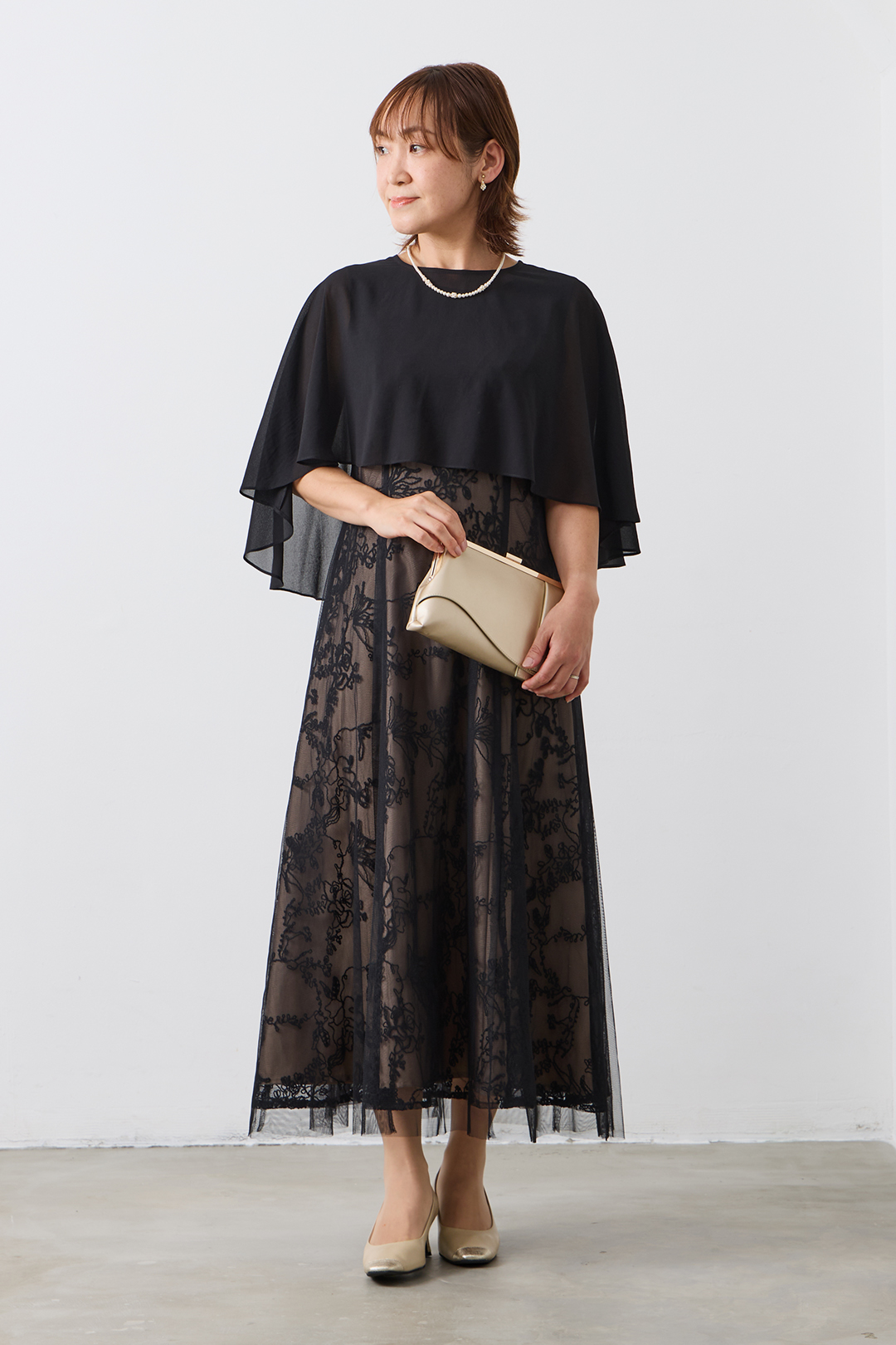 繊細な刺繍レースにチュールをレイヤードしたミモレ丈ドレス。無地のケープは品よく上半身をカバーしてくれます。
