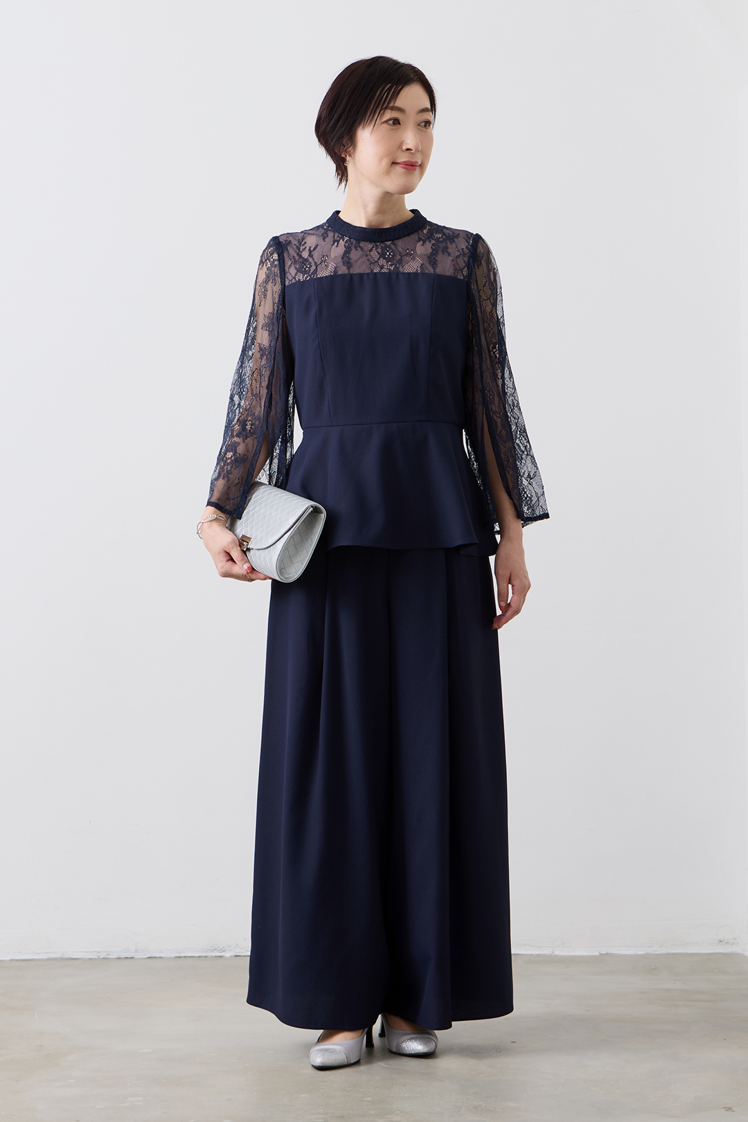 レーススリーブが程よい華やかさのあるブラウスと、エレガントなワイドパンツのセットアップ。